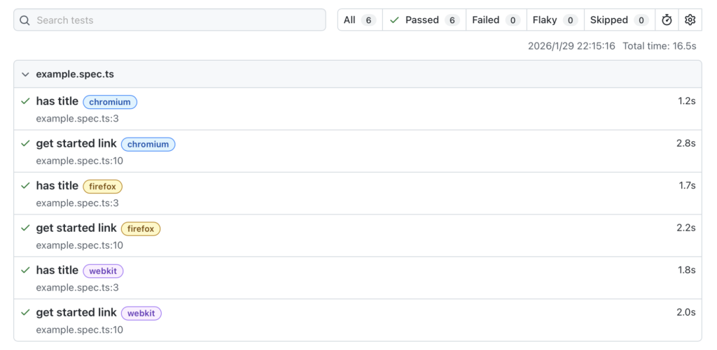 2つのテストを3つのブラウザで実行しているため、テスト結果が6つ表示されます。